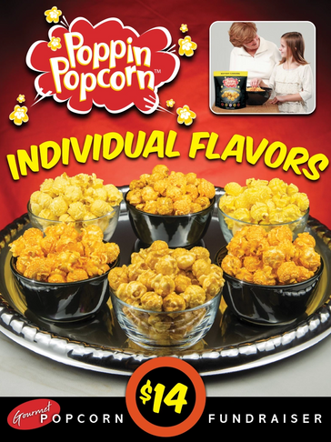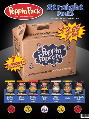 In our "In-Hand" sales Poppin Pack Fundraising program, you simply purchase a case or cases, have your participants sell and collect the profits. Our Straight Packs include one of our delicious flavors: Buttery Caramel, Cheesy Cheddar, Cheddar Jalapeño, Chicago Style, White Cheddar, Fruity or Movie Theater Butter. Each carrier contains 30 of each flavor.