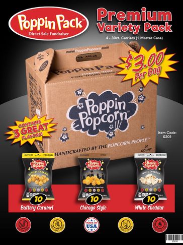 In our "In-Hand" sales Poppin Pack Fundraising program, you simply purchase a case or cases, have your participants sell and collect the profits. Our Premium Variety pack includes three of our house favorites: Buttery Caramel, Chicago Style and White Cheddar. Each carrier contains 10 of each flavor. It’s the perfect combination with something to please everyone.